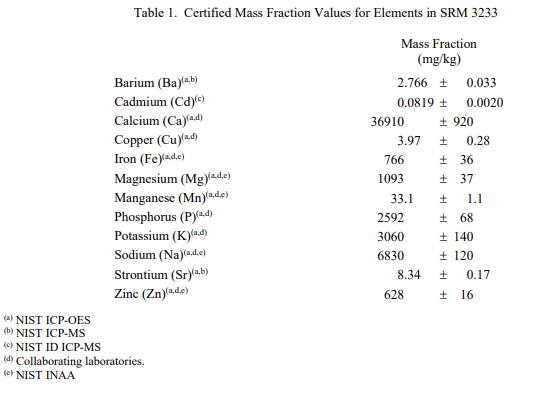 表 1 和表 2 提供了 SRM 3233 中元素和維生素的認(rèn)證質(zhì)量分?jǐn)?shù)值,以干質(zhì)量為基礎(chǔ)報告。NIST 認(rèn)證值是 NIST 對其準(zhǔn)確性有最高置信度的值因為所有已知或可疑的偏見來源都已被調(diào)查或考慮 [1]。價值分配分析由 NIST 和合作實驗室進(jìn)行。認(rèn)證值計算為 NIST 方法的平均值、美國農(nóng)業(yè)部 (USDA) 方法的平均值以及合作實驗室提供的平均結(jié)果的中位數(shù)(如果適用)。所有值在沒有加權(quán)的情況下合并。相關(guān)的不確定性以 95% 的置信水平表示 [2-4]。
