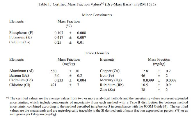表 1 提供了 12 種元素的認證值,以干質量上的質量分數 [1] 表示。汞的認證值基于單一 NIST 主要方法的結果,冷蒸氣同位素感應稀釋法耦合等離子體質譜法,并在 NIST 通過放射化學中子活化分析得到證實。其他元素的認證值基于兩個或多個經過嚴格評估的獨立分析技術的結果。 NIST 和美國地質調查局 (USGS),丹佛,CO 進行了分析。 NIST 認證值是 NIST 對其準確性有最高置信度的值,因為所有已知或可疑的偏差來源都已被調查或考慮在內帳戶 [2]。