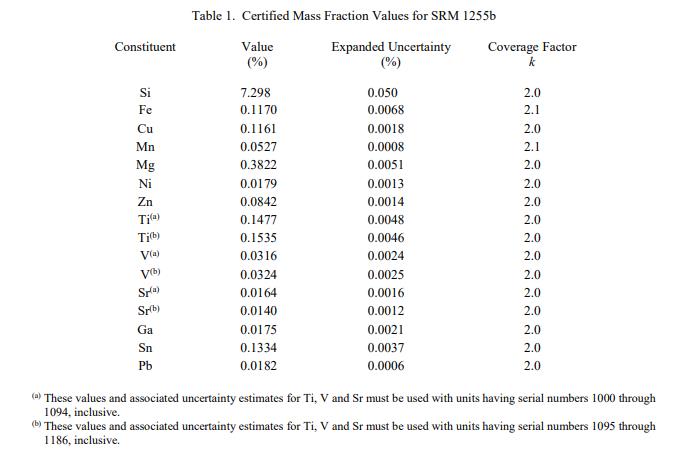 NIST SRM 1255b - 鋁合金356(圓盤形) 中成分的認證值列在表 1 中,作為鋁基體中元素總量的質量分數 [1]。 NIST 認證值是 NIST 對其準確性有最高置信度的值,因為所有已知或可疑的偏差來源都已考慮在內。認證值是對真實值的當前最佳估計。認證值在計量上可追溯至以百分比表示的 SI 派生的質量分數單位。每個規定的值是來自多個實驗室的三種分析方法的結果的未加權平均值。隨數值列出的不確定度是擴展的不確定度,使用列出的覆蓋因子 [3-5] 以大約 95% 的覆蓋率表示。